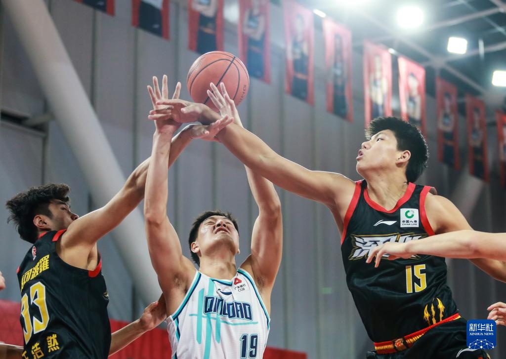 12月9日乐鱼骰宝,深圳马可波罗队球员胡小龙(右)、王浩然(左)在比赛中与青岛国信水产队球员区俊炫争抢篮板。新华社发(彭志刚摄)