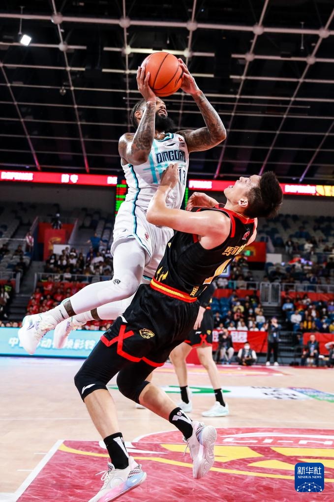 12月9日,青岛国信水产队球员鲍威尔(上)在比赛中上篮。新华社发(彭志刚摄)