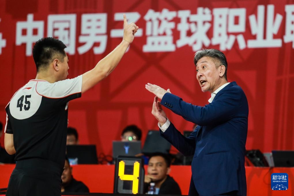 12月9日,深圳马可波罗队主施展郑永刚(右)在比赛中与裁判疏通。新华社发(彭志刚摄)