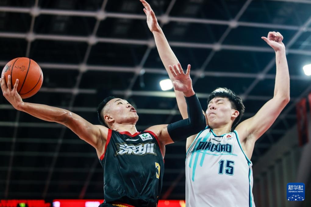 12月9日,深圳马可波罗队球员贺希宁(左)在比赛中上篮。新华社发(彭志刚摄)