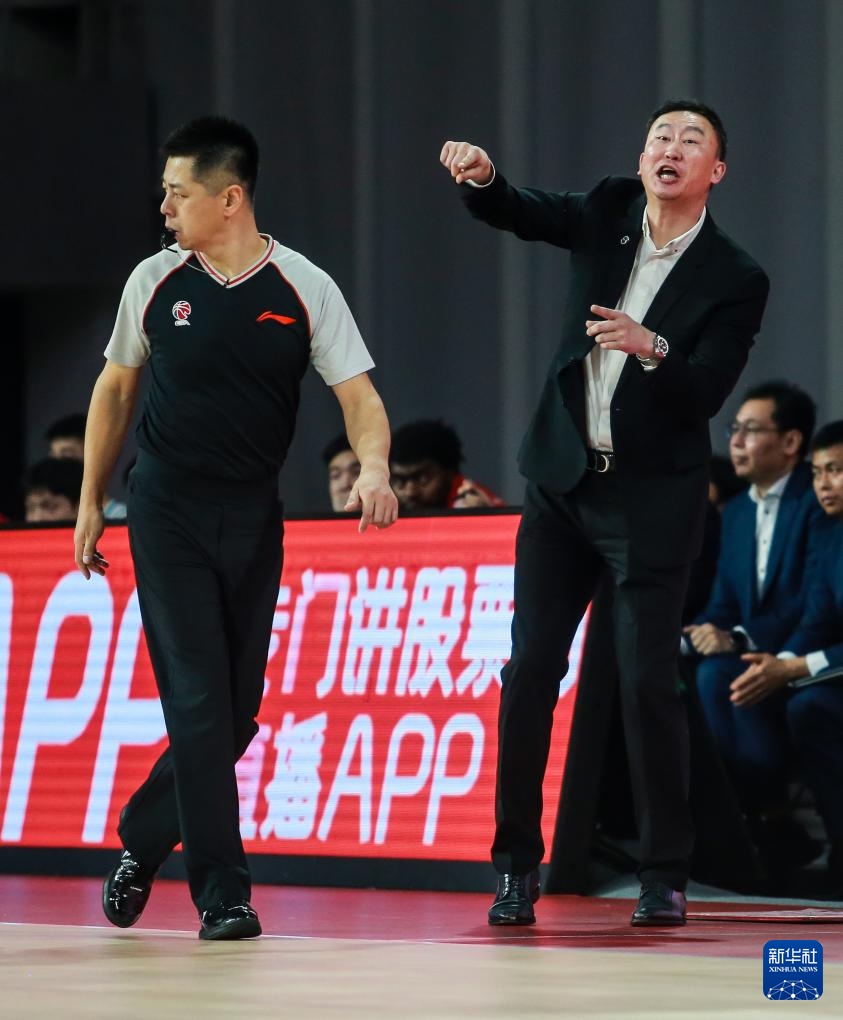 12月9日,青岛国信水产队主施展刘维伟(右)在场边指点。新华社发(彭志刚摄)